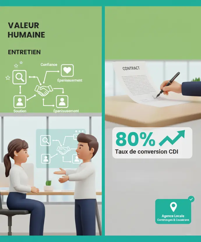 Pour les personnes ayant un objectif de CDI, nous affichons un taux de conversion de l'intérim au CDI de 80 % !